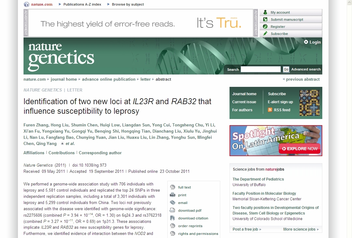 10月24日,国际著名学术期刊《自然•遗传学》(Nature Genetics)在线发表我国科学家发现2个新的麻风易感基因的研究成果。这是继2009年《新英格兰医学杂志》(New England Journal of Medicine)发表该团队麻风易感基因研究成果之后又一原创性成果,标志着我国在该领域继续处于世界领先水平。