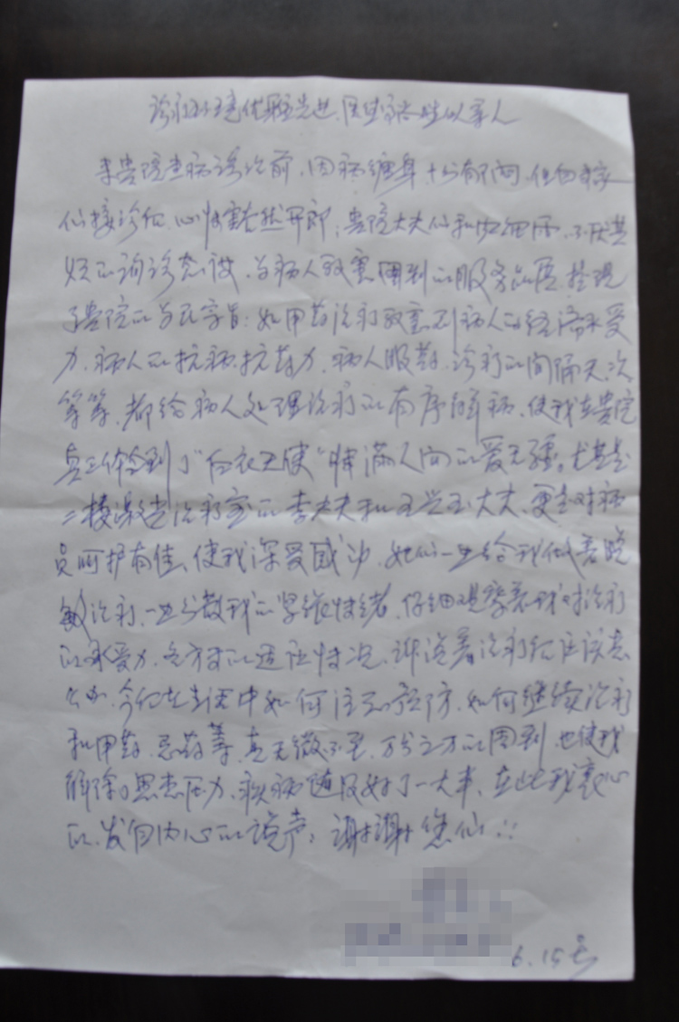 感谢信——感谢病房医护人员