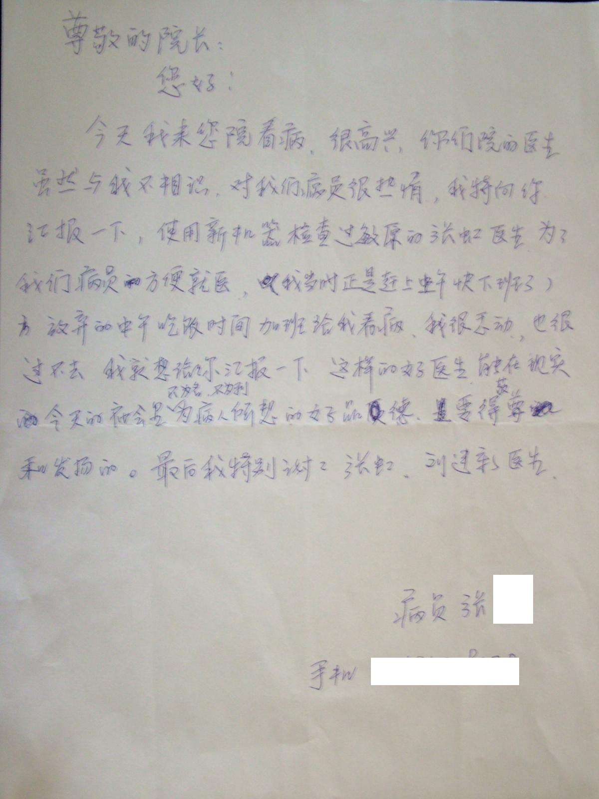 感谢信---患者表扬张虹、刘建新同志