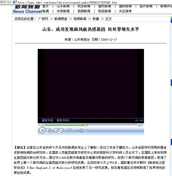 山东成功发现麻风病易感基因 处世界领先水平-新闻频道