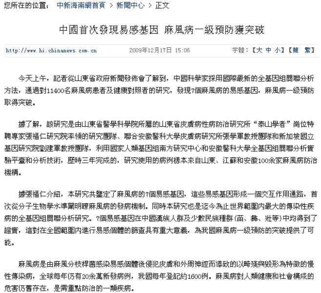 中国首次发现易感基因 麻风病一级预防获突破-中新网海南首页
