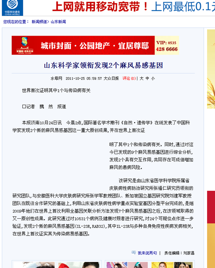 今晨2点,国际著名学术期刊《自然·遗传学》在线发表了中国科学家发现2个新的麻风易感基因这一重大原创成果,并在世界上首次证明了其中1个和传染病有关。同时,通过对迄今已发现的9个麻风易感基因进行综合分析,发现2个具有交互作用,共同存在可成倍增加麻风的患病风险。