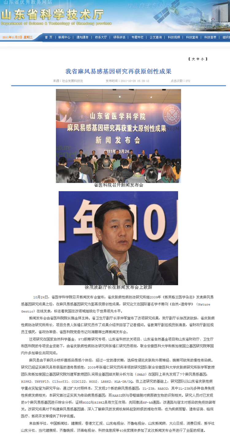 山东省科学技术厅-我省麻风研究再获原创性成果