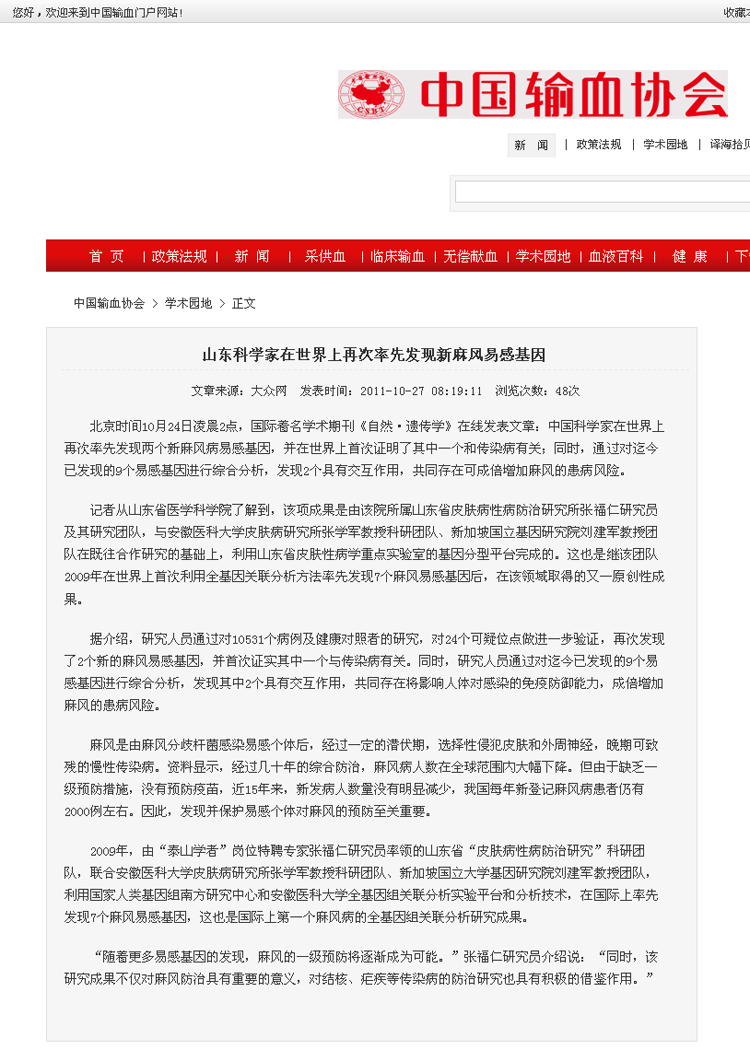 中国输血协会-中国科学家在世界上再次率先发现新麻风易感基因