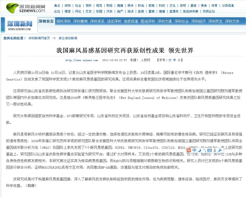 这项研究由山东省皮肤病性病防治研究所张福仁研究院领衔,联合安徽医科大学皮肤病研究所张学军教授团队和新加坡国立基因研究院刘建军教授团队等国内外多加单位共同完成。这是继2009年《新英格兰医学杂志》(New England Journal of Medicine)发表该团队麻风易感基因研究成果之后又一原创性成果。
