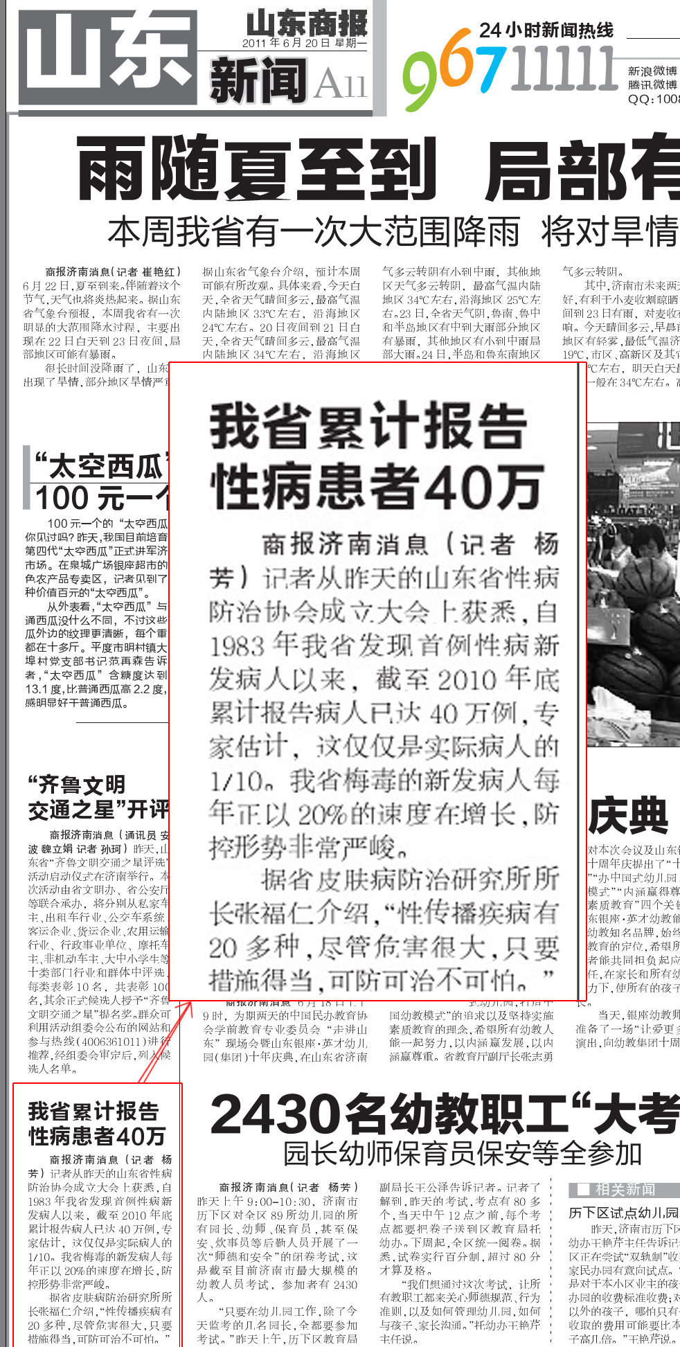 商报济南消息(记者 杨芳)记者从昨天的山东省性病防治协会成立大会上获悉,自1983年我省发现首例性病新发病人以来,截至2010年底累计报告病人已达40万例,专家估计,这仅仅是实际病人的十分之一。我省梅毒的新发病人每年正以百分之二十的速度在增长,防控形势十分严峻。
