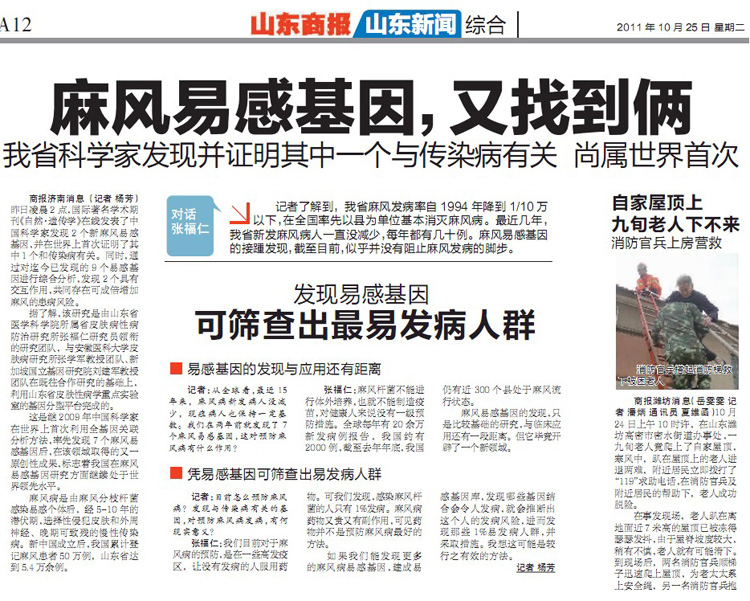 山东科技报-山东科学家又发现两个麻风病易感基因