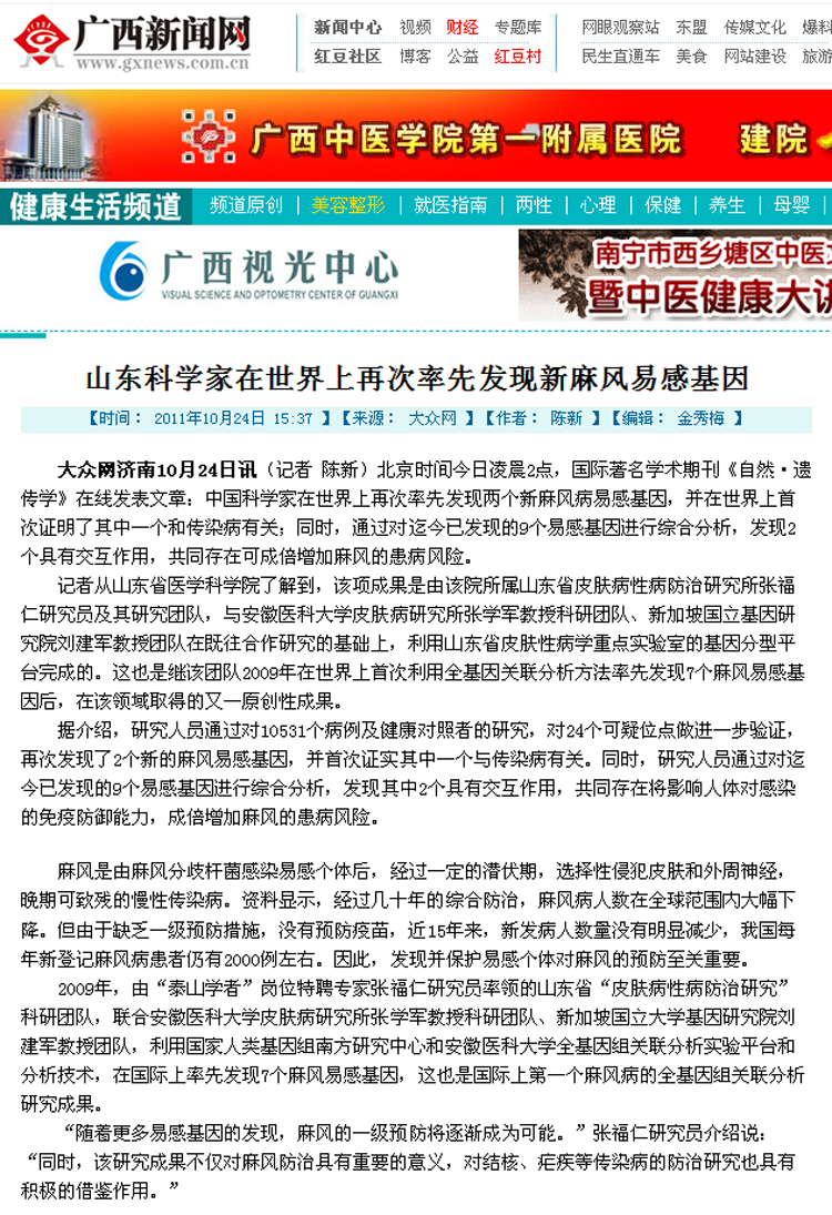 广西新闻网健康频道-山东科学家在世界上再次率先发现麻风易感基因