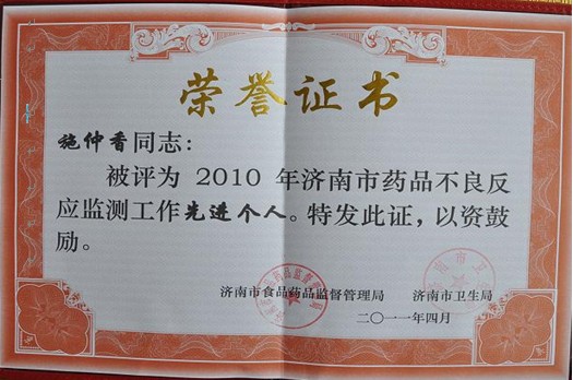 2011年4月8日,济南市召开药械安全性监测总结表彰会议,山东省皮肤病医院被授予“医疗器械不良事件监测工作先进单位”荣誉称号,施仲香同志以2010年我所药物不良反应报告第一名的成绩被授予“药品不良反应监测工作先进个人” 荣誉称号。