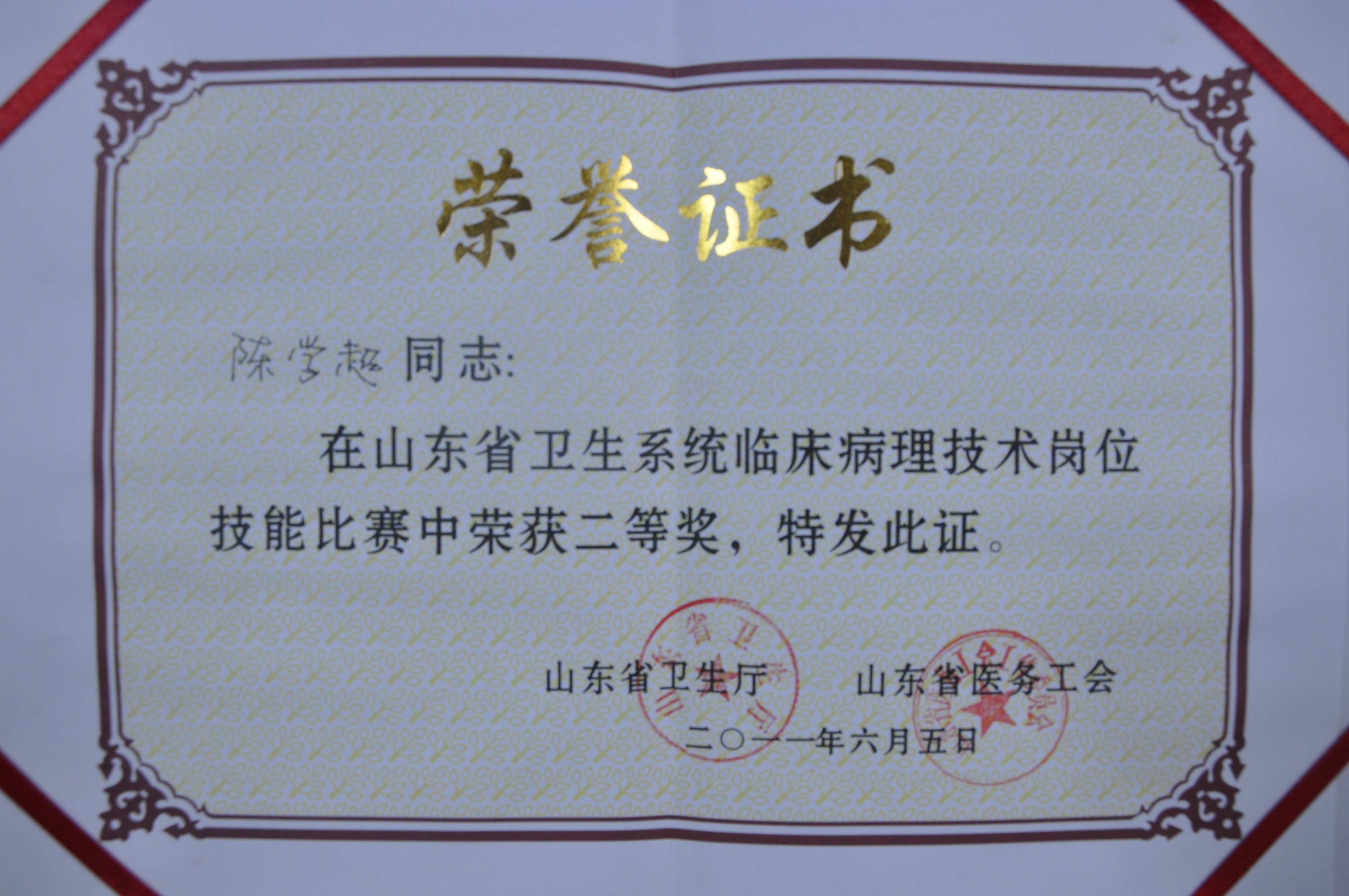 2011年6月3—4日山东省医务工会和卫生厅医政与医疗服务监管处主办,省病理质量控制中心承办了山东省临床病理技术岗位技能比赛,我院病理科陈学超大夫参加了比赛,并获得了二等奖的好成绩。