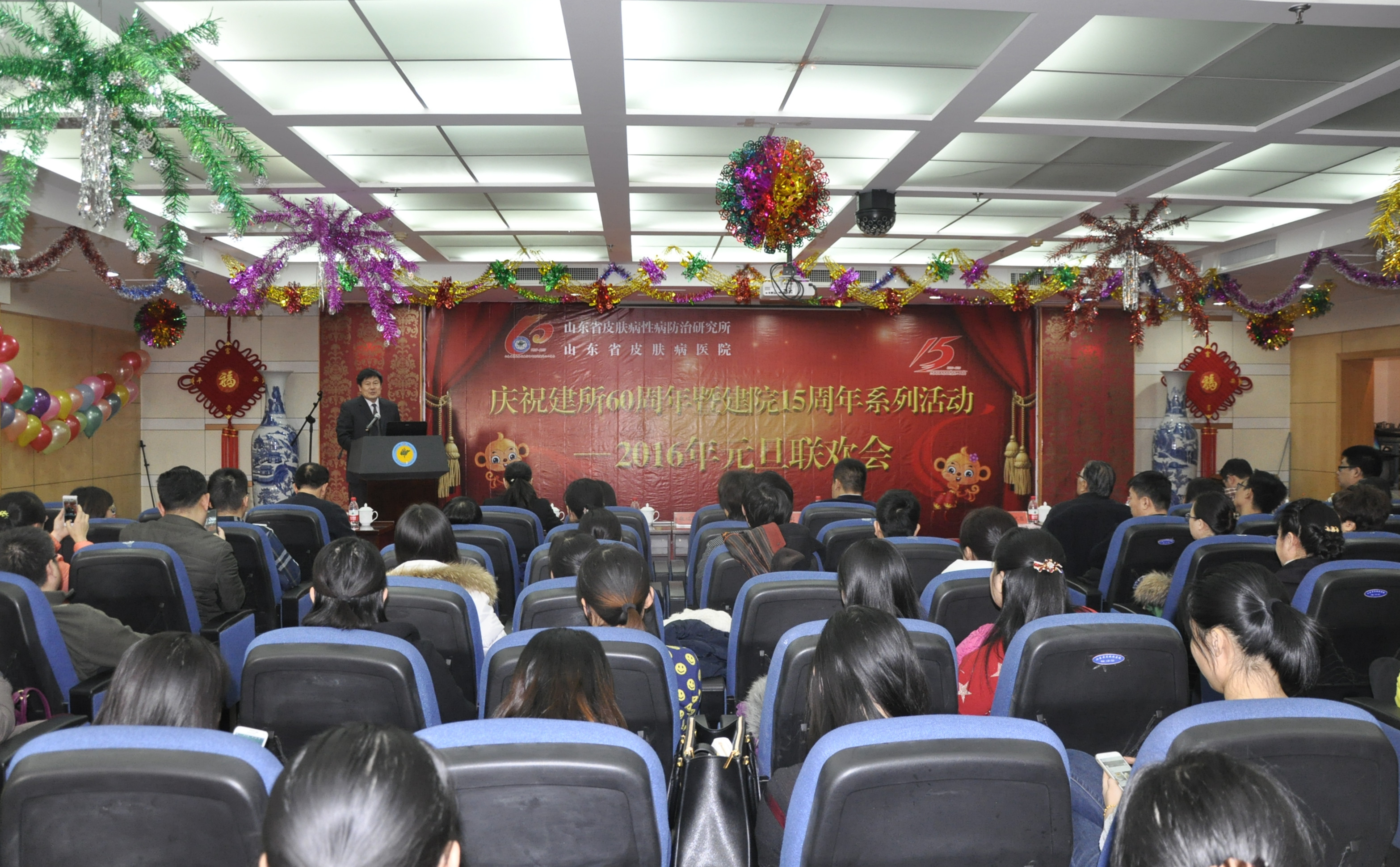 12月18日,山东省皮肤病性病防治研究所/山东省皮肤病医院在门诊楼礼堂举行庆祝建所60周年暨建院15周年系列活动—2016年元旦联欢会。活动由所党委书记王婷主持,所领导班子成员、在职职工和仍然在工作岗位上发挥余热的老同志以及来自省内外的毕业研究生代表共计150余人参加活动。