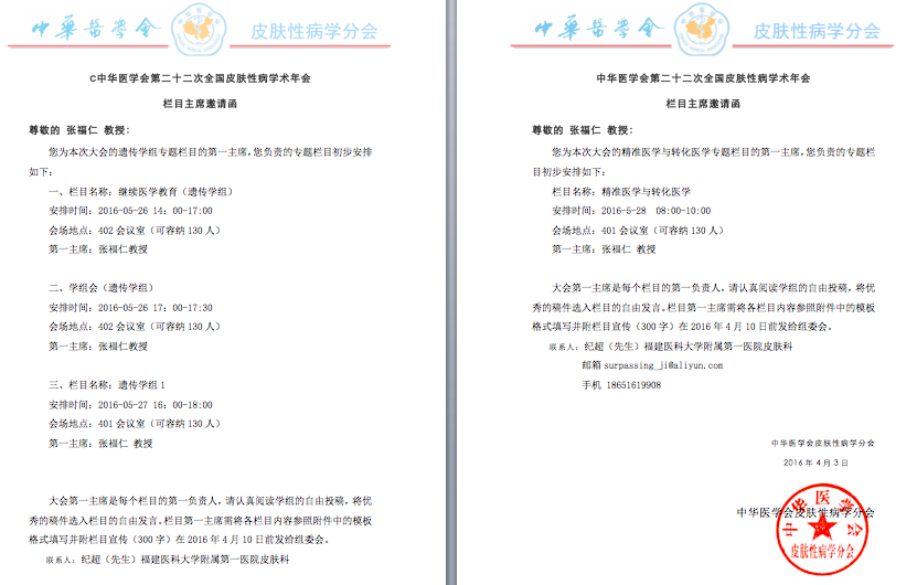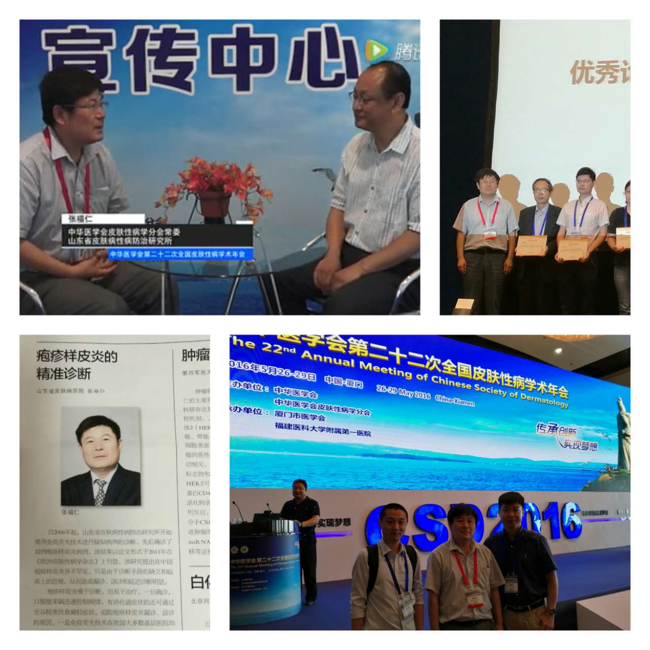我院本次参加会议共计9人,进行大会发言12次,主持专场5次,书面交流和壁报交流13次。范围涉及“继续医学教育”、“遗传病例展示与讨论”,“精准医学与转化医学”,“病理疑难病例讨论”,“感染性疾病专场”和”ISD regional meeting 英文会场”. 会议期间,张福仁研究员被年会宣传中心专题参访,探讨了对年会的举办和在遗传性皮肤性及药物不良反应研究领域的进展的看法;张福仁研究员的专题报告“疱疹样皮炎的精准诊断”被大会每日会讯作为会议亮点重点推荐并刊载。