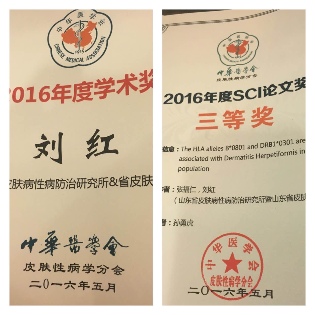以张福仁研究员、刘红副研究员为通讯作者,孙勇虎博士为第一作者的论文《The HLA alleles B*0801 and DRB1*0301 are associated with Dermatitis Herpetiformis in a Chinese population》获得2016“中华医学会皮肤性病学分会SCI论文奖”,这也是自2012年设此奖项以来,我所第四次获得此奖项。