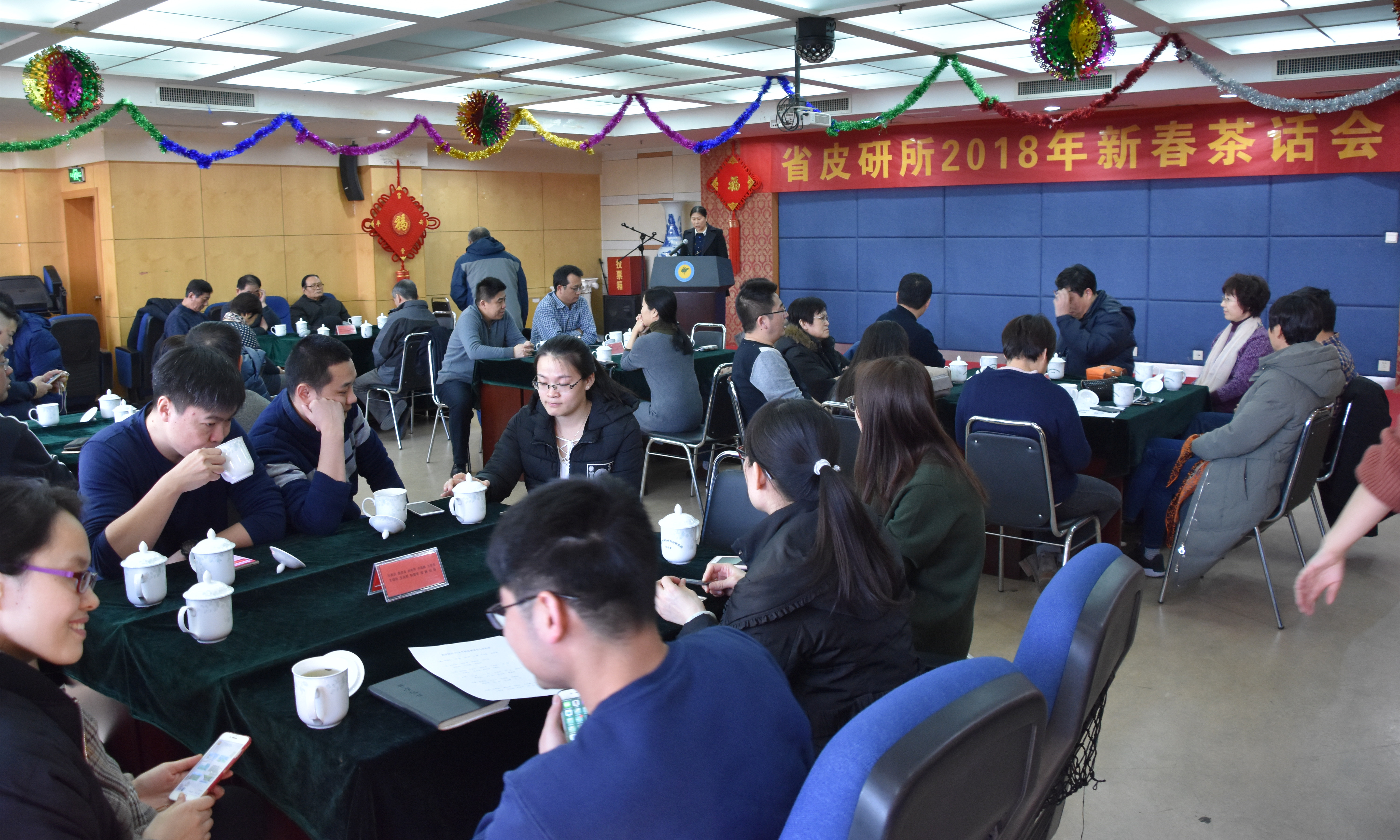 辞旧灵鸡歌日丽,迎新瑞犬报年丰。2月12日,省皮研所举办2018年新春茶话会,所领导班子、离退休老同志代表、专业技术人员代表、留学回国人员代表、民主党派代表和全所科室主任欢聚一堂,同贺新春、共话未来。