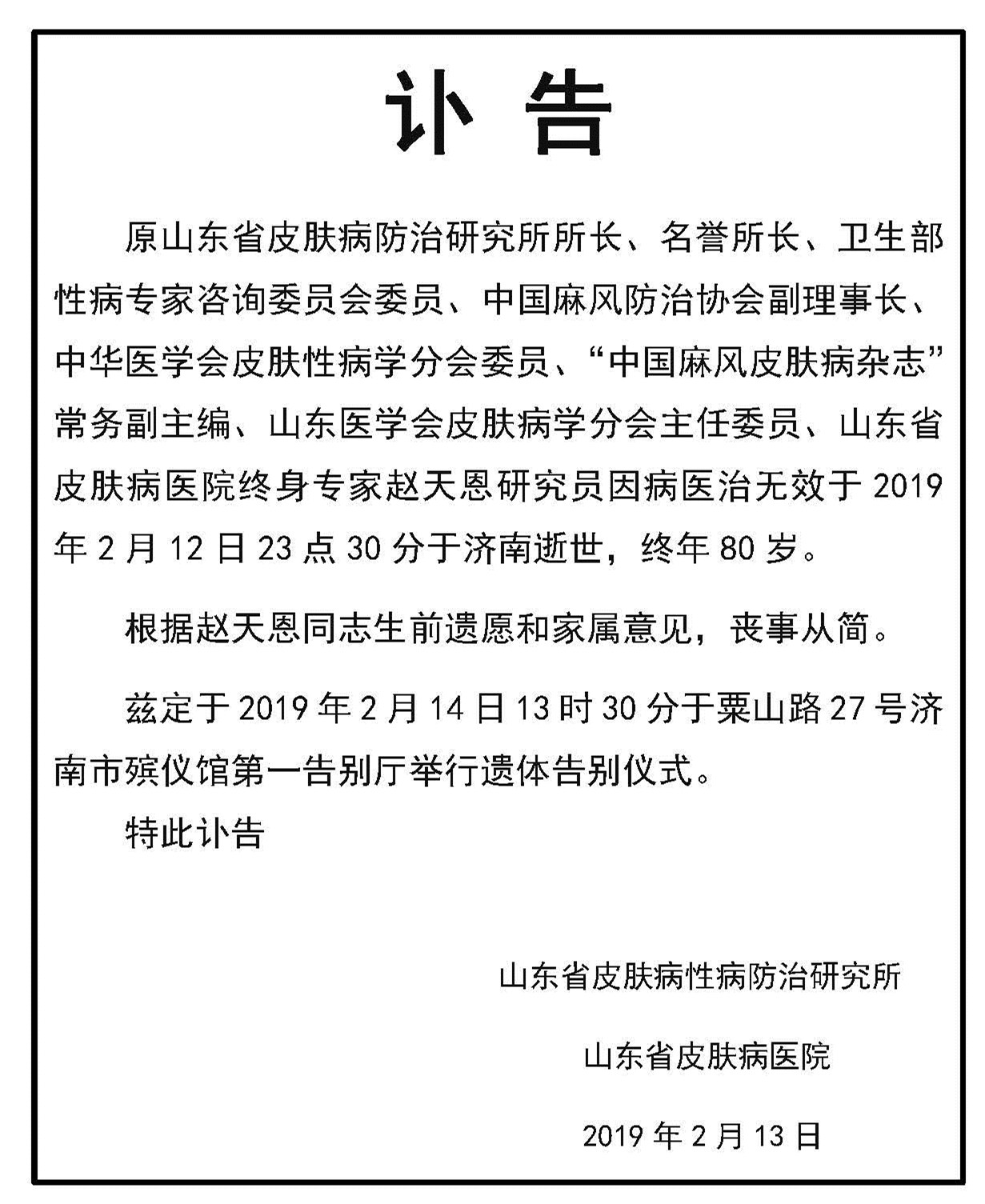 60年来赵天恩同志悬壶济世、治病救人,把毕生精力献给了麻风皮肤病防治事业,赵天恩同志千古!