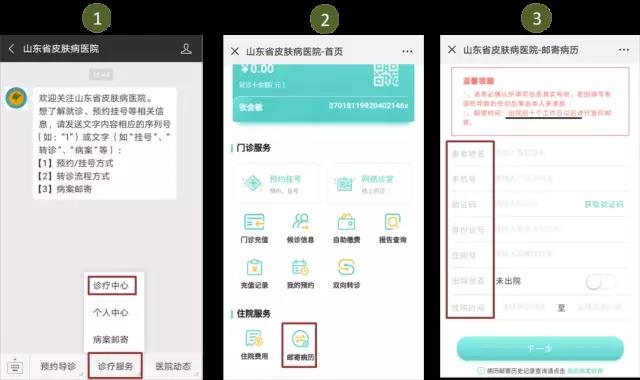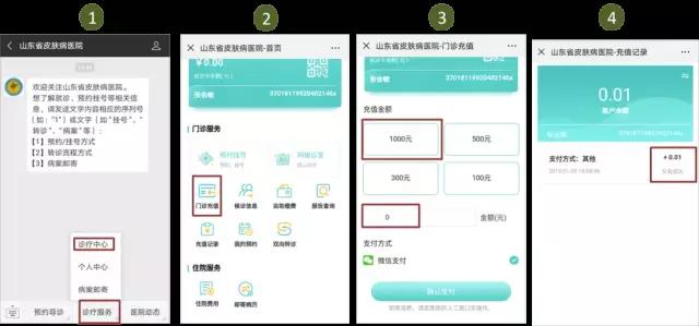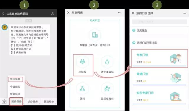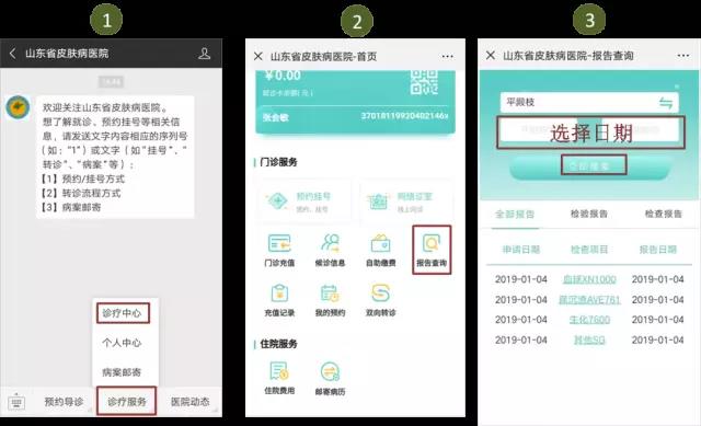 小流程,大智慧! 关注“山东省皮肤病医院”微信公众号让您就医更便捷! 这么多人,啥时候能看上病,肿么办? 我想看的医生没号了,肿么办? 检查结果当天出不来?我是外地的,咋整啊。。。 排队缴费人好多啊,啥时候能做上检查? …… 别着急,让我们来教你如何快捷就医, 解决上面的难题~ 关注“山东省皮肤病医院”微信公众号,预约挂号、门诊充值、自助缴费、报告查询等等全部搞定,哦,住院患者复印病历,也不用出院后再跑哦,在线申请,邮寄到家。 爽不爽?高兴不高兴? 首先,关注并进入“山东省皮肤病医院”公众号: 一、预约挂号/挂号 选择【预约导诊】→ 选择科室(以皮肤科为例) → 选择【专家门诊/普通门诊】→ 选择医生/就诊日期 → 选择就诊时间→ 点击【添加就诊人】→ 输入个人信息 → 点击【预约】后即可收到预约成功通知 当天预约步骤同上 温馨提示:身份证、医保卡就是我们的就诊卡呢,预约后就诊时别忘记带哦~~ 二、门诊充值/自助缴费 进入【山东省皮肤病医院】公众号 → 点击【诊疗服务】→ 选择【诊疗中心】→点击【门诊充值】→ 选择/输入充值金额 →【确认支付】后会出现“支付成功”提示 如果医生已经开具了化验检查,您就直接选择上图第二步的【自助缴费】,会出现相应的缴费金额,点击【确认支付】就完成了~ 三、检查报告查询 进入【山东省皮肤病医院】公众号 → 点击【诊疗服务】→ 选择【诊疗中心】→点击【报告查询】→ 选择检查日期 → 搜索结果后即可查看 四、住院病历邮寄 注意:一定核对好个人信息及地址,之后就可以坐等收快递了~ 第二步页面功能多多,抬起您的小手指,多多点击、探索吧~~ ☆ 本页面还可以查询【预约记录】和【充值记录】 ☆ 点击【我的预约】还能查询预约记录呢 ☆ 点击查询【候诊信息】还可以让您卡点就诊,不用再竖着耳朵听叫号啦~ ☆ 随时关注医院动态,还有科普知识哦~ ☆ 智能导诊还在努力开发中,以后会越来越丰富! 好了,今天就传授到这里了 有没有感觉这份“秘笈”很贴心? 快推荐给你的朋友们吧~ 新的一年,新的希望, 新的征程, 让我们满怀信心和期待迎接崭新的2019年! 山东省皮肤病医院全体医务人员谨祝大家新年快乐,阖家幸福!猪年诸事大吉! 别忘了扫描二维码,关注公众号哦 山东省皮肤病医院 山东省皮肤病性病防治研究所 咨询电话:0531-87298826 地址:济南市槐荫区经十路27397号