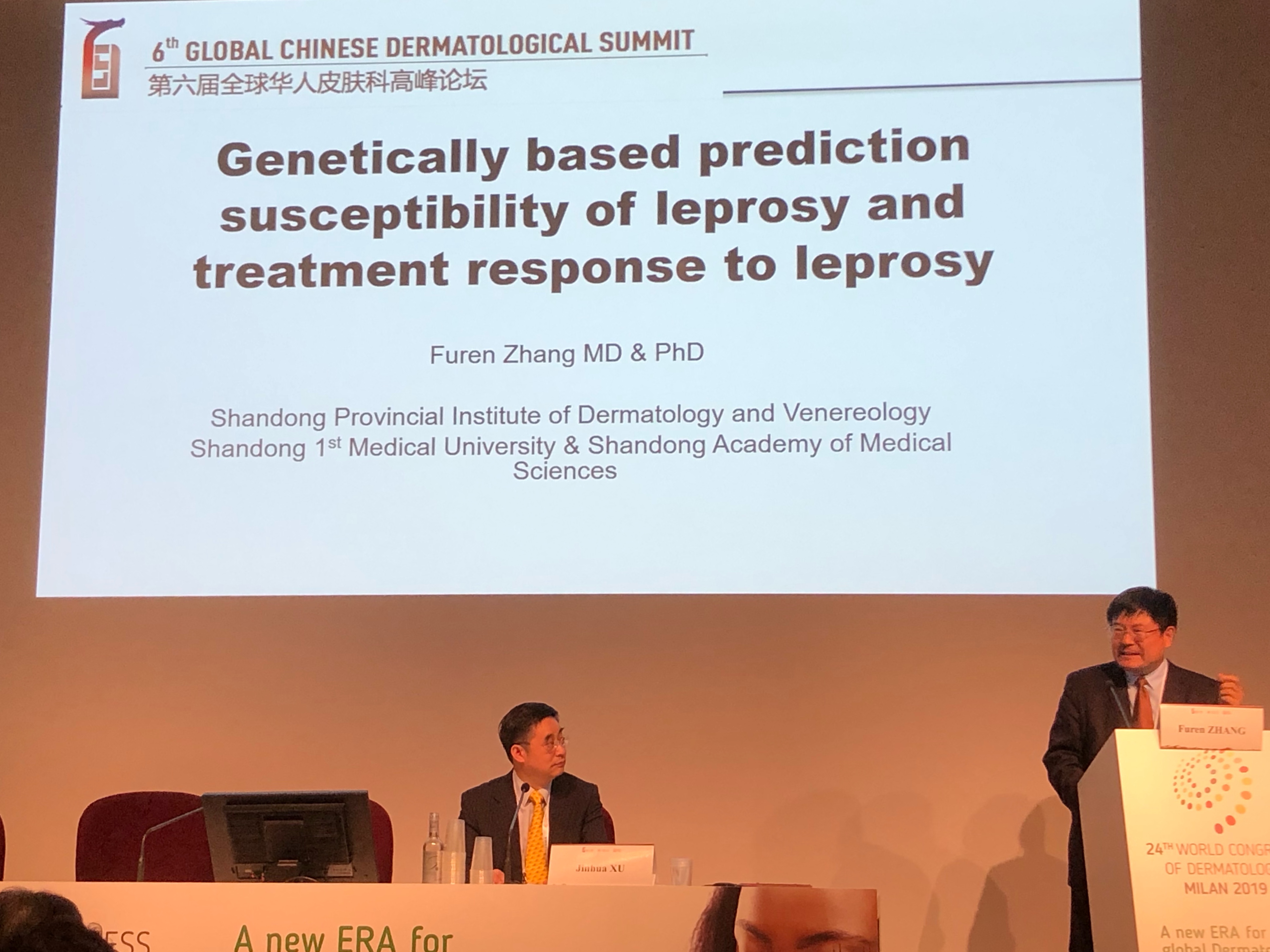2019年6月10日下午,山东省皮肤病医院张福仁教授参加了以“ Translational research in China: Regulation and Practices ”为主题的中国皮肤科学高峰论坛&全球华人高峰论坛,并做了 < 基因指导下麻风诊疗和预防新方法 > 的大会报告,向国际同行介绍了团队近年来在麻风预防、诊断、治疗方面新技术的开发和应用效果。