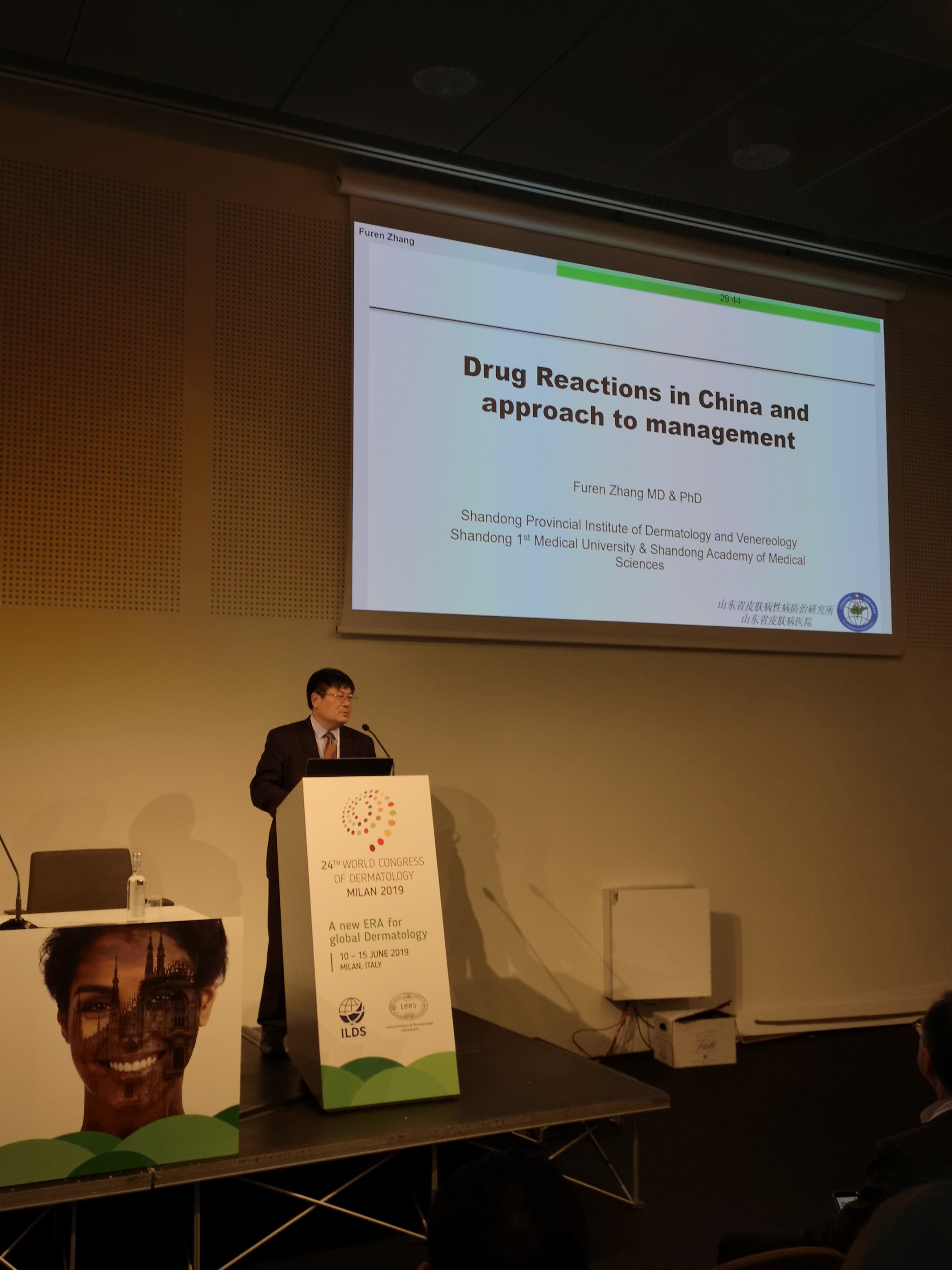 2019年6月12日上午,山东省皮肤病医院张福仁教授,英国利物浦大学Dean Nasibitt教授,印度Vimond Sharma教授共同主持了<常见药物不良反应>学术专场,在这场药物不良反应的学术讲座中,张福仁教授向国际同行介绍了中国药物不良反应研究进展和控制,从中国药物不良反应的控制,流行病学研究,临床特征研究,病因学研究,发病机制研究以及转化医学研究等方面介绍了中国皮肤科医生近年来的研究进展。印度的Vimond Sharma教授和Lalit Gupta教授分别分享了药物不良反应最新进展和新型生物制剂导致的药物不良反应,加拿大Neil Shear教授对药物不良反应诊断和研究方面的进展进行了综述,英国利物浦大学Dean Nasibitt教授对皮肤反应和免疫调控通路中药物特异性T淋巴细胞的研究进行了分享。