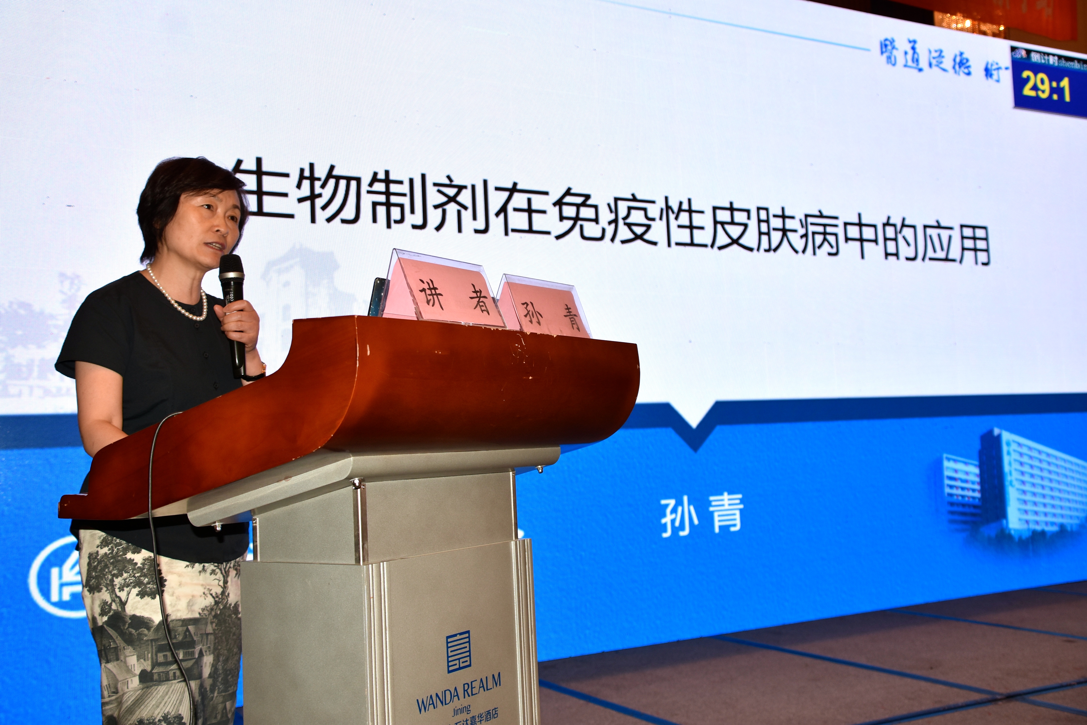 山东大学齐鲁医院皮肤科主任孙青教授作《生物制剂在免疫性皮肤病治疗中的应用》讲座,介绍了多种生物制剂在银屑病、特应性皮炎、慢性荨麻疹等免疫性疾病中的治疗方案及疗效、不良反应,并分享益赛普治疗斑块型银屑病的病例,提出生物制剂有着广阔的应用前景。