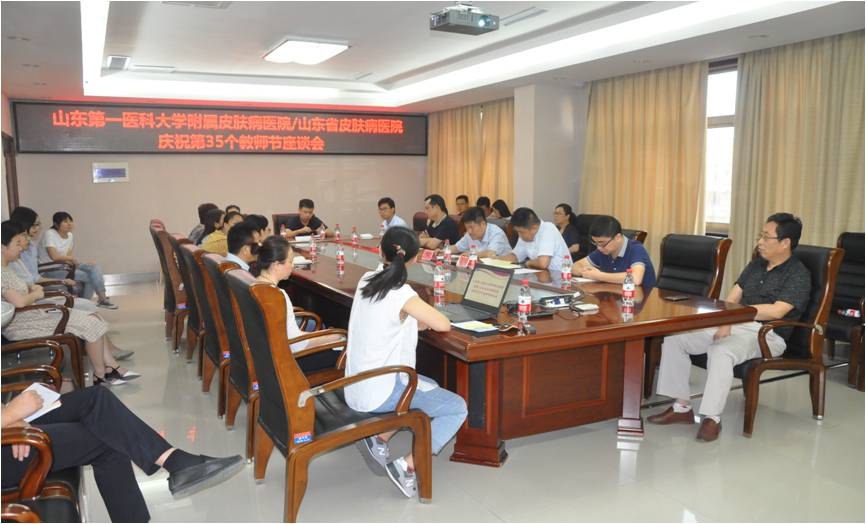 9月6日,教师节来临之际,山东第一医科大学附属皮肤病医院/山东省皮肤病医院召开庆祝第35个教师节座谈会,山东第一医科大学(山东省医学科学院)副校(院)长、山东省皮肤病性病防治研究所&山东省皮肤病医院所(院)长张福仁出席会议并讲话,院长助理田洪青以及研究生导师代表、相关科室主任、研究生、规培生代表共26人参加座谈,副院长刘健主持座谈会。
