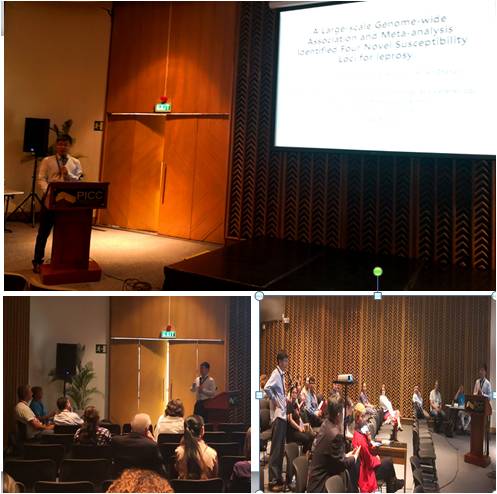 随后本团队孙勇虎博士报告了团队近十年来在麻风遗传免疫方面的研究进展,吸引了大会主席和参会代表的浓厚兴趣,并展开了热烈讨论。其中日本Akira教授提到,他对张福仁教授级其团队2016年报告的易感基因PPARG的功能进行了验证,并发现该基因在麻风分枝杆菌与宿主免疫交互作用和泡沫细胞形成发挥重要作用,他表示他的团队还将继续围绕我们发现的易感基因进行深入后续研究。本团队在麻风易感基因领域的研究不仅走在国际前沿,也正在引领该领域的研究方向。