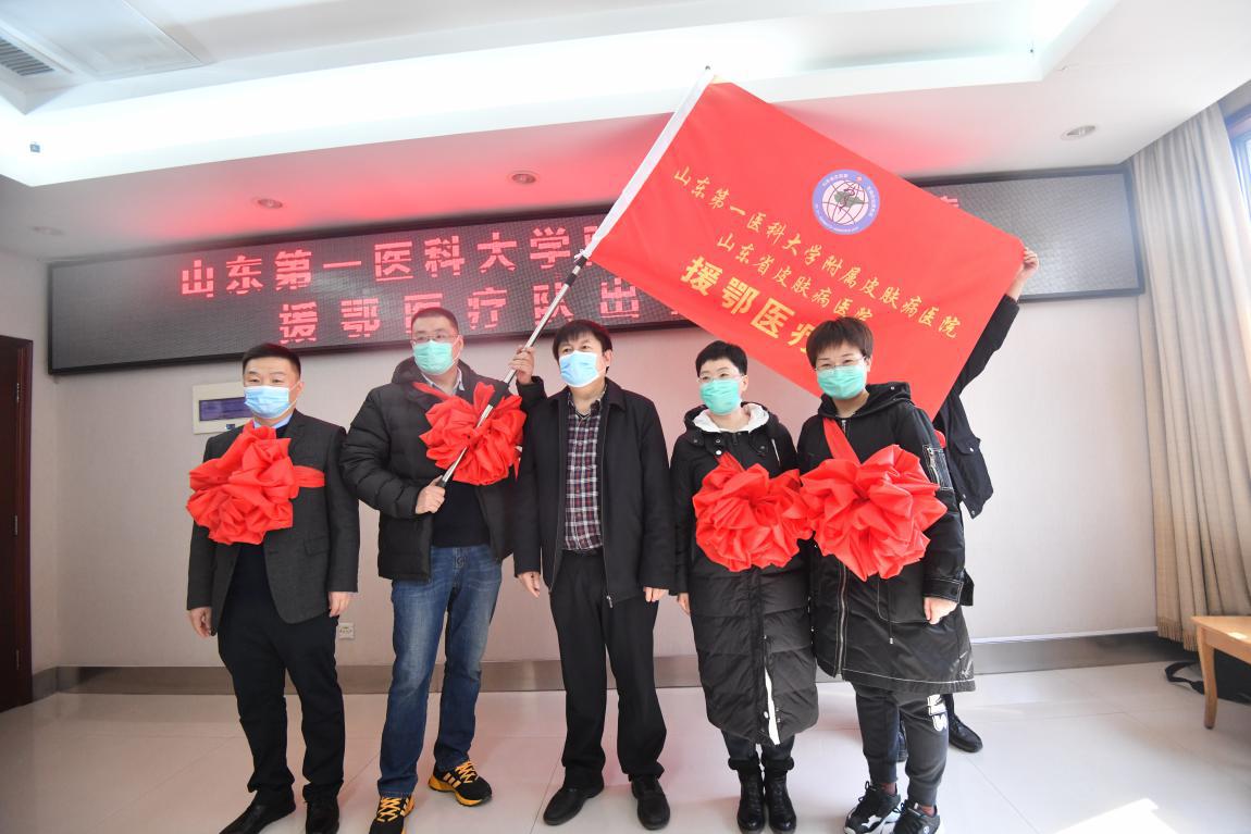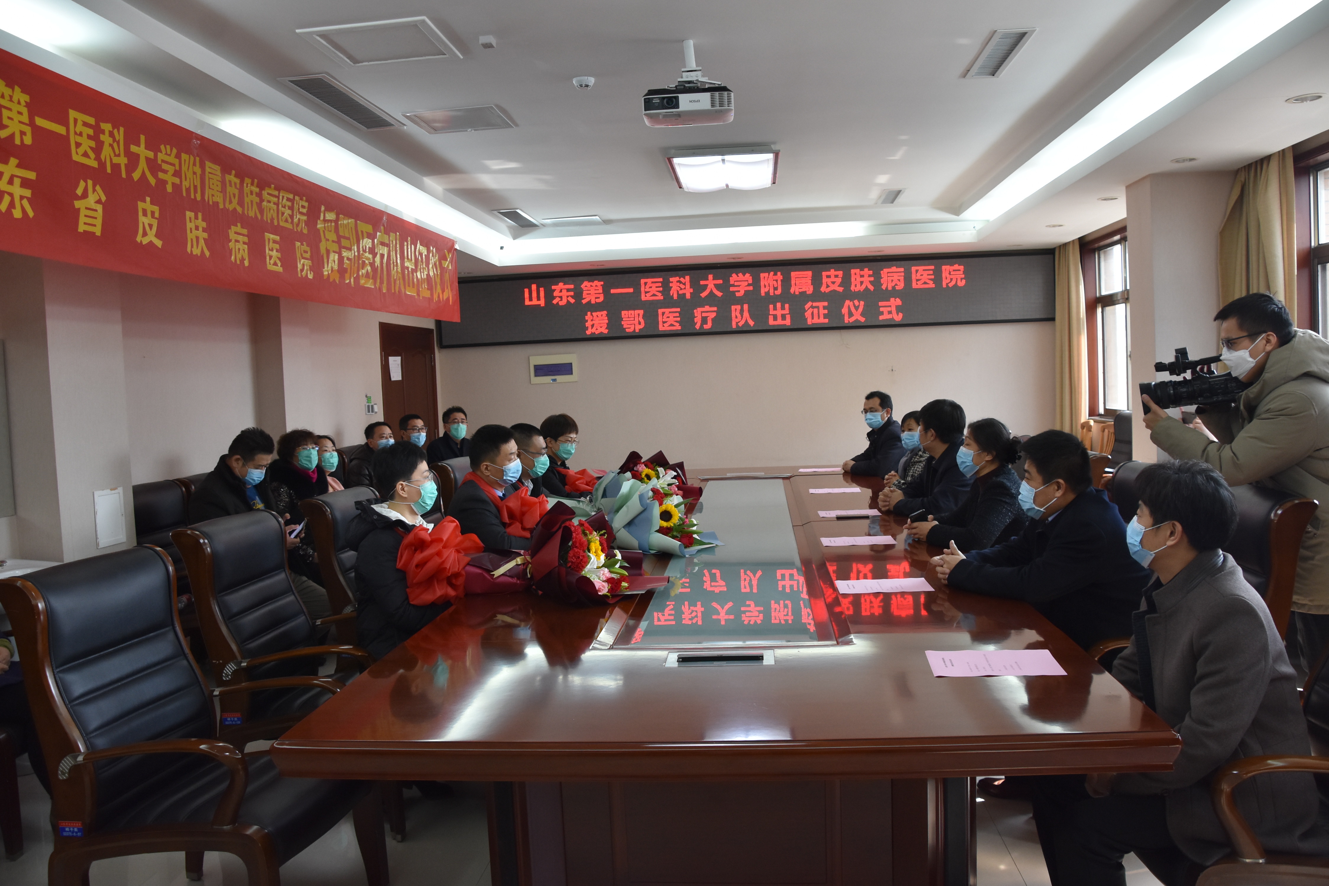 2月20日上午11:00,山东第一医科大学附属皮肤病医院举行援助湖北医疗队出征仪式。院长张福仁、党委书记王婷以及所领导班子成员,4名出征队员及相关科室负责人参加。