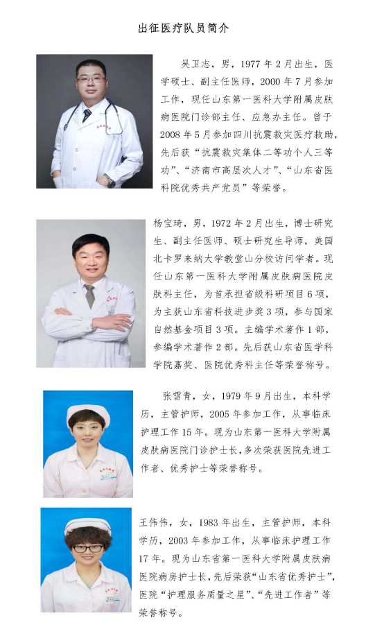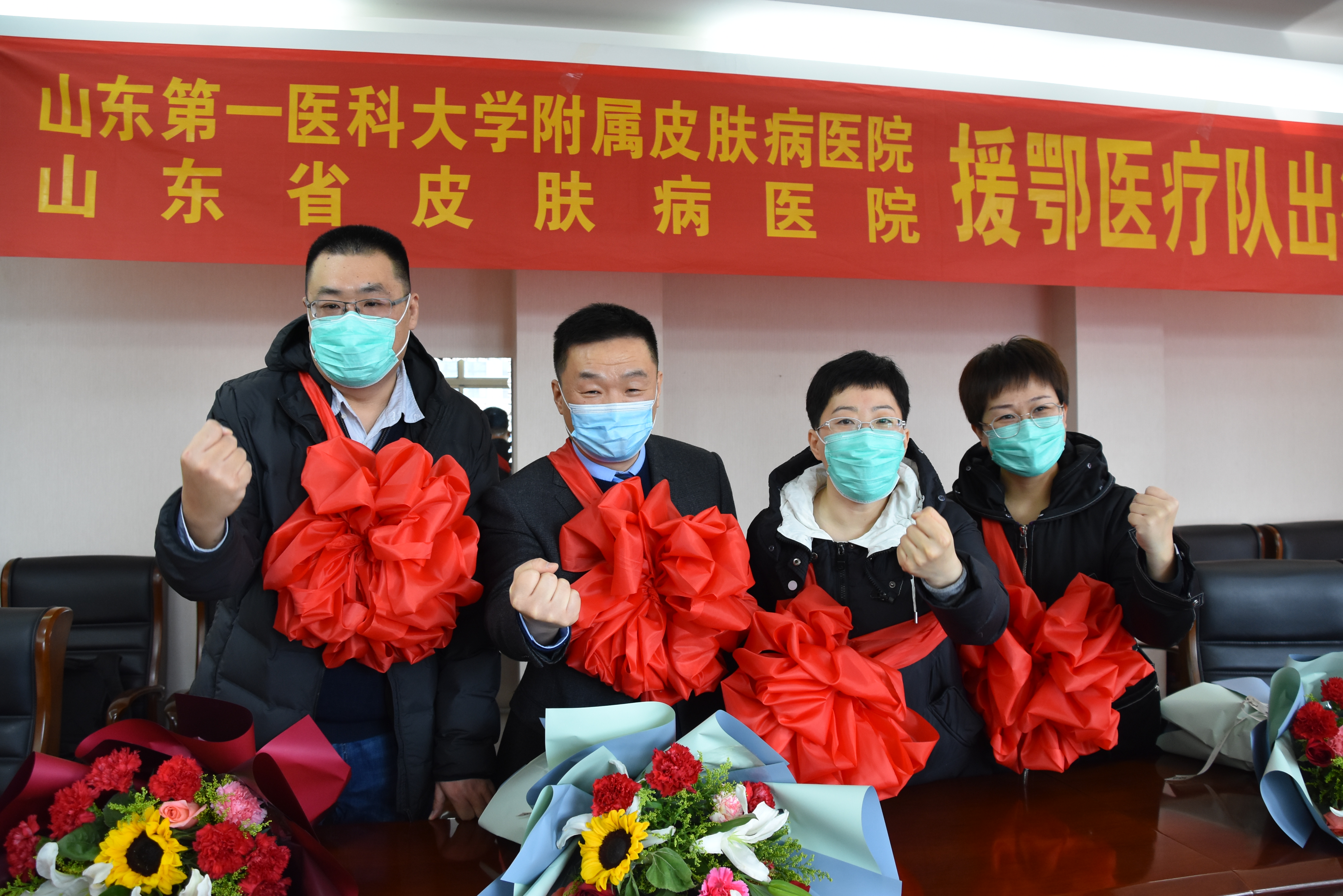 2月19日上午10时,按照省卫健委《关于组派第十二批医疗队援助湖北应对新型冠状病毒感染的肺炎疫情的通知》,山东第一医科大学附属皮肤病医院党委迅速响应,1小时内部署完毕,在前期组建的医护预备队伍中选出两位医生和两位护士援助武汉。他们分别是门诊部/应急办主任、副主任医师吴卫志,皮肤科主任、副主任医师杨宝琦,主管护师王伟伟,主管护师张雪青。