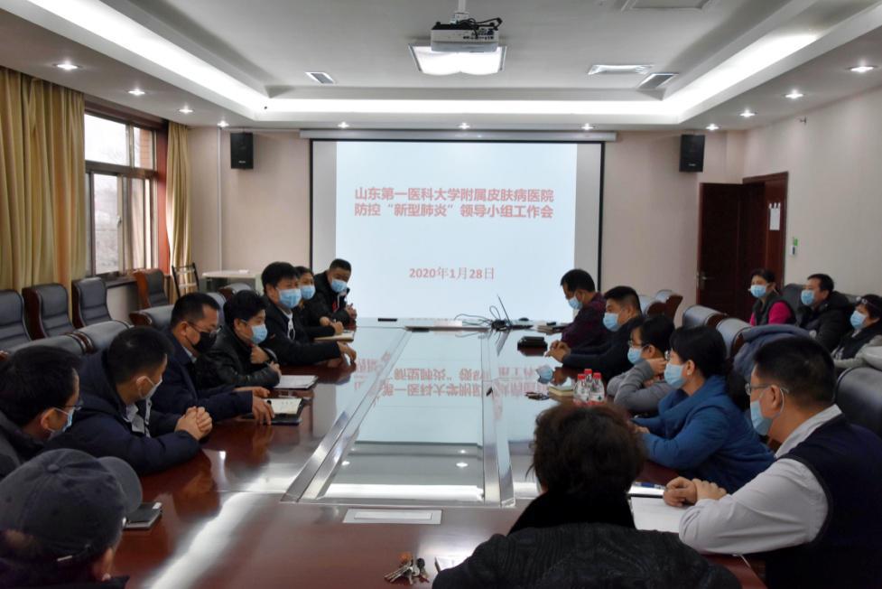 新冠肺炎疫情发生时正值春节期间,医院第一时间成立防控新冠肺炎领导小组,由山东第一医科大学(山东省医学科学院)副校(院)长、山东第一医科大学附属皮肤病医院院长张福仁,党委书记王婷担任组长,全面部署预检分诊、院感防控、人员防护、环境消毒等各项防疫工作,落实责任分工。