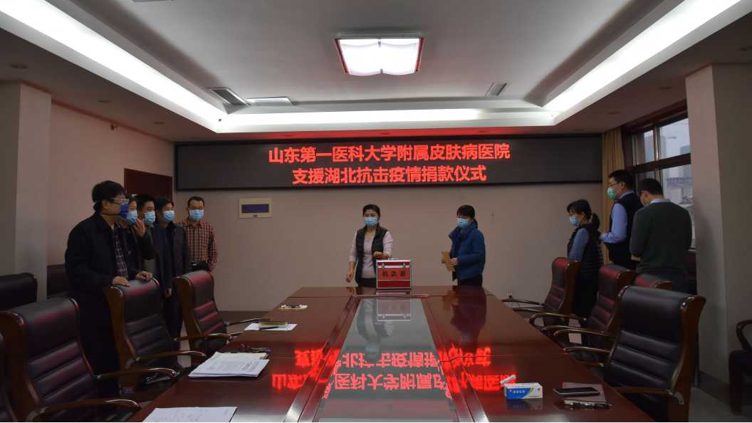 为全力支持湖北疫情防控工作,在防疫抗疫工作紧张进行之际,院党委统一部署,组织支援湖北疫情防控爱心捐款活动,倡议全体干部职工,伸出援助之手,助力疫情防控工作。全院209人共筹集善款97800元,全部上交山东省红十字会统一支援湖北。此外,我院向山东援鄂医疗队捐赠硅油乳膏、尿素乳膏各2000支,用于一线医护人员的手面部防护。