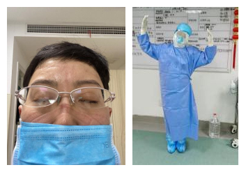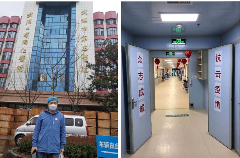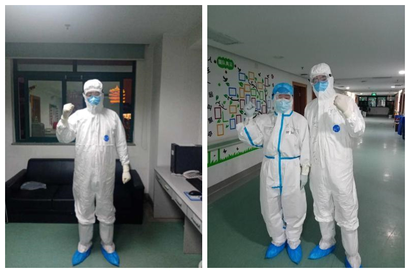 左图:因为身材较高,同事特意联系护士长为吴卫志主任找来不多见的大号防护服,叮嘱他要防护到位,这让他特别感动