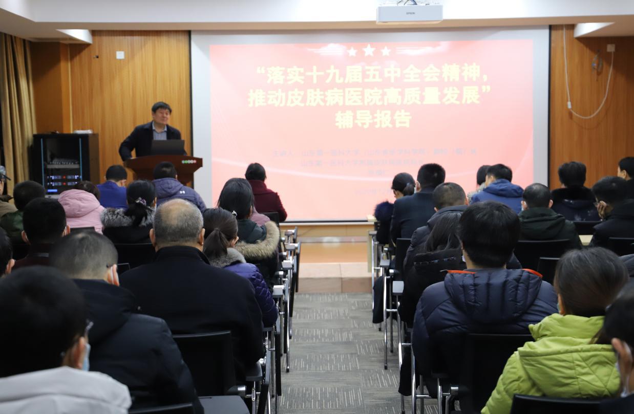 为深入学习宣传贯彻党的十九届五中全会精神,引导广大党员干部职工把思想统一到全会精神上来,统一到以习近平同志为核心的党中央决策部署上来,推动兴起学习宣传贯彻全会精神的热潮,根据山东第一医科大学(山东省医学科学院)党委统一部署安排,山东第一医科大学附属皮肤病医院于12月9日举办“党的十九届五中全会精神宣讲会”。