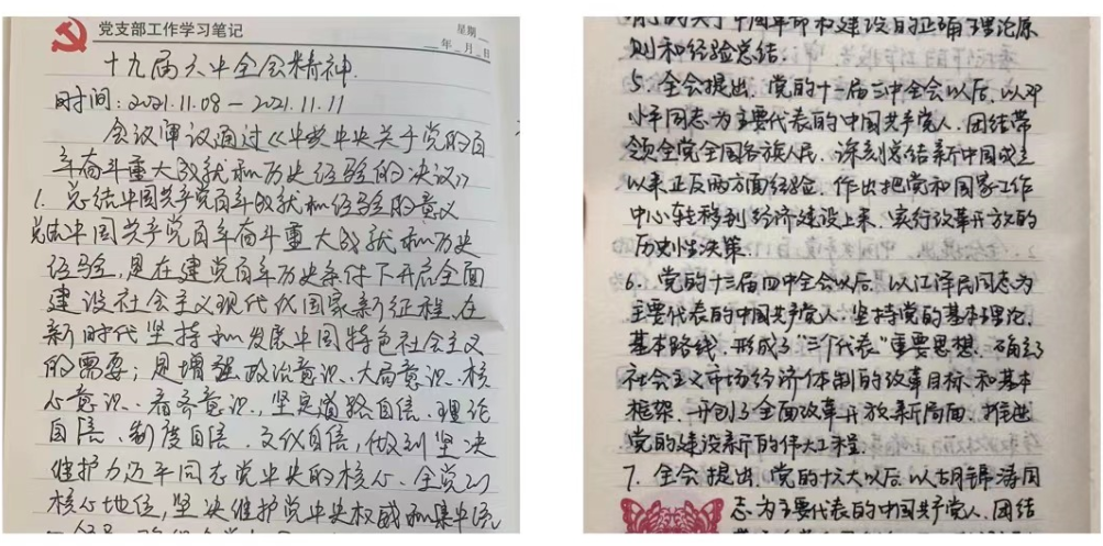 各党支部掀起学习贯彻党的十九届六中全会精神热潮。各党支部书记带头学原文、悟原理,切实增强了学习宣传、贯彻落实全会精神的政治自觉、思想自觉和行动自觉,通过集中学习、个人自学、交流研讨、撰写心得等多种方式,确保学深悟透、入脑入心。